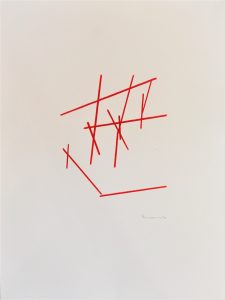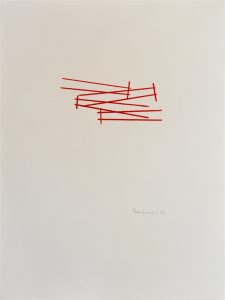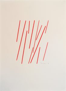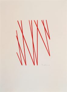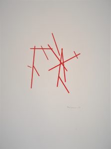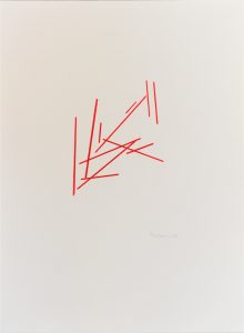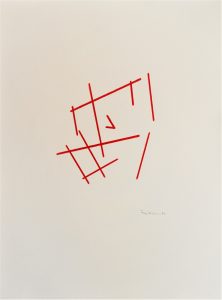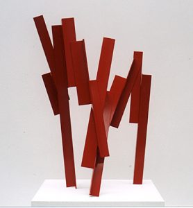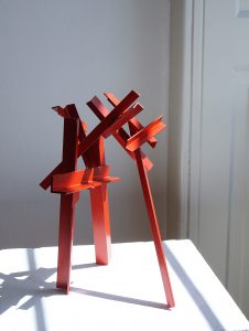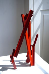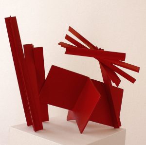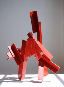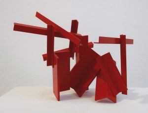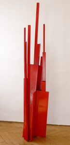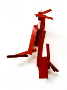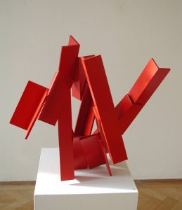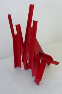 Die Basis aller Konstruktion ist bei Christoph Freimann ein imaginärer Quader oder Kubus, dessen 12 Kanten der Künstler in neue Ordnungsstrukturen bringt. Nach Auflösung der Ausgangsform, verändert er ihre Kantenlängen und Massen. Er addiert 12 unterschiedlich lange und starke Winkelprofile, löst spielerisch das Raumgerüst auf und bündelt die Einzelteile um einen Fixpunkt. Es entsteht ein plastischer den Raum umfassender Körper von unglaublicher Dynamik und Leichtigkeit. Entgegen der Gravitationsgesetze türmen sich die Winkelelemente stufig auf und definieren einen Umraum mit großem Spannungsbogen, der auf der Balance unterschiedlicher Massen und ihrer Gewichtung beruht. Dabei wird die Eleganz der Raumplastik und ihre Leichtigkeit durch die rote Lackierung der Stahlmassen erhöht.