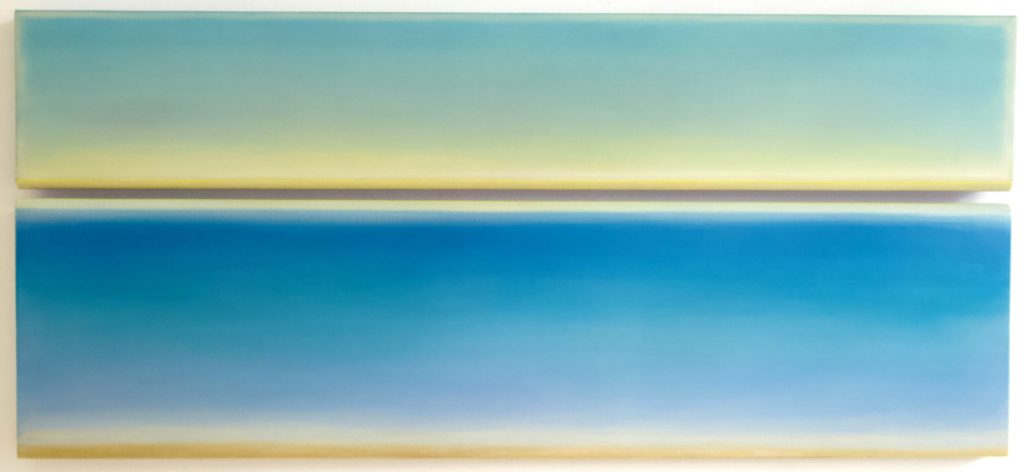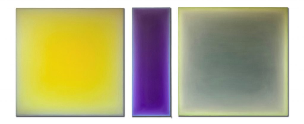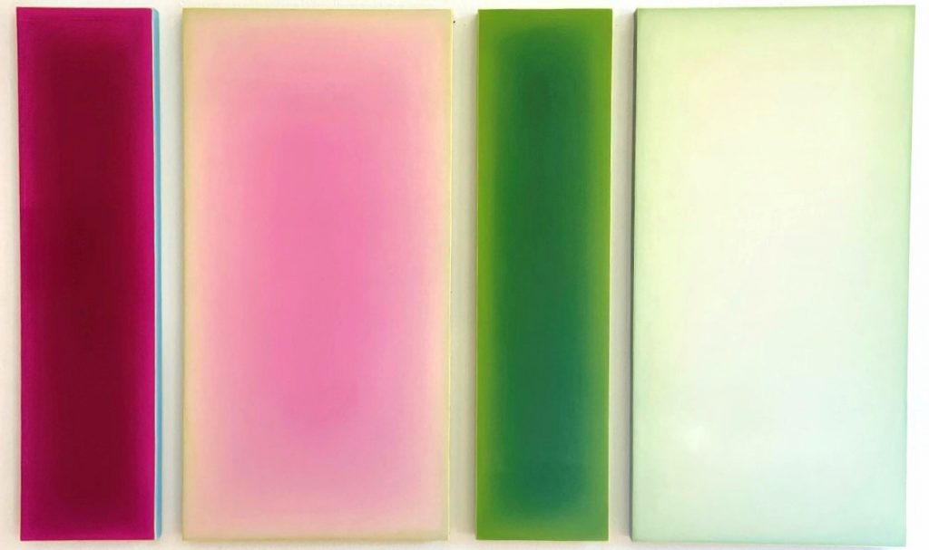 Die monochrom anmutenden Bilder der koreanischen Künstlerin YeunHi Kim (1955*) lassen sich in ihrer Eigenständigkeit keiner bekannten Kategorie klar zuordnen. Sie haben eine gewisse Verwandtschaft zur Farbfeldmalerei und grenzen sich dennoch davon ab. Wie in der amerikanischen Malerei der 60-iger Jahre tritt in ihren Bildern eine bewusste Reduktion der Bildaussage auf additive Farbflächen auf, die mit fein ausgelotetem Abstand zueinander die Farbnuancen zum Schwingen bringen. Sie thematisiert wie diese auf mehrteiligen aneinander gereihten Bildtafeln die reine Farbe und deren interaktive Spannung. Dabei sind ihre Werke befreit vom konkreten Sujet und künstlerischen Gestus. Sie strahlen die reine Form und Farbe aus.